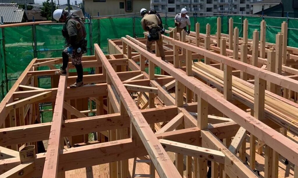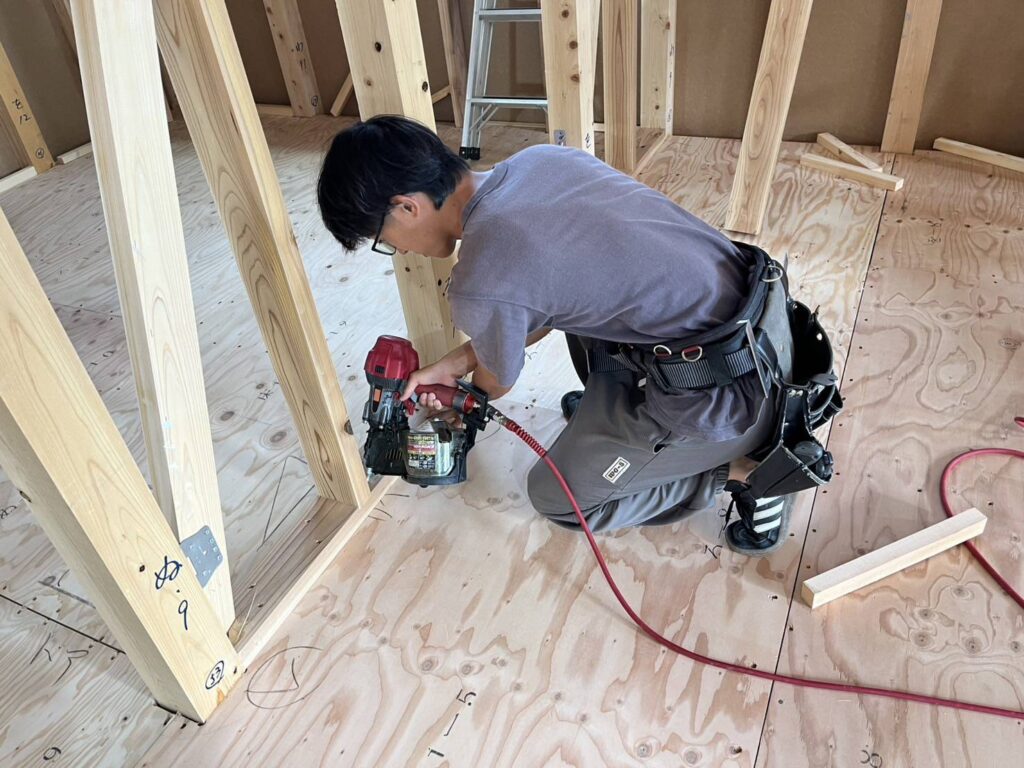 現場では、職人さんたちが柱や梁の水平・垂直を細かく確認しながら、一つひとつ丁寧に施工しています。