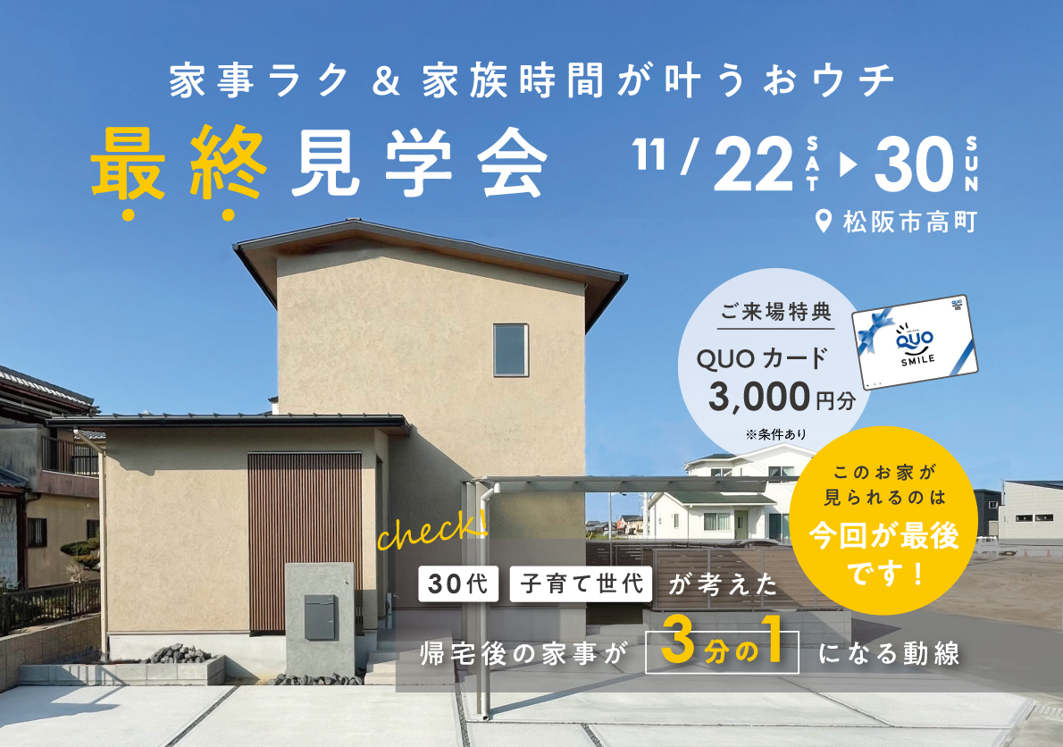 さて、中美建設では、「家事ラク&家族時間が叶うおウチ最終見学会」を11/30(日)まで開催中です!