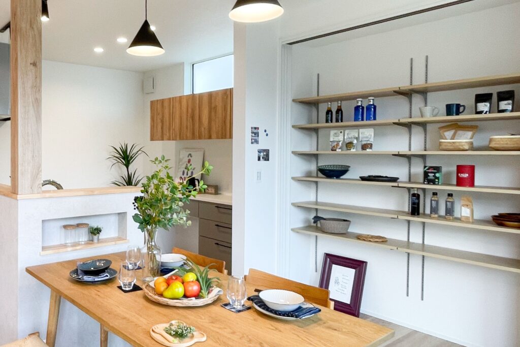 ダイニング後ろの横長パントリーは、食材や日用品をまとめて収納。横長の設計のため、何がどこにあるか一目で分かり、無駄な買い物や探す時間も減ります。