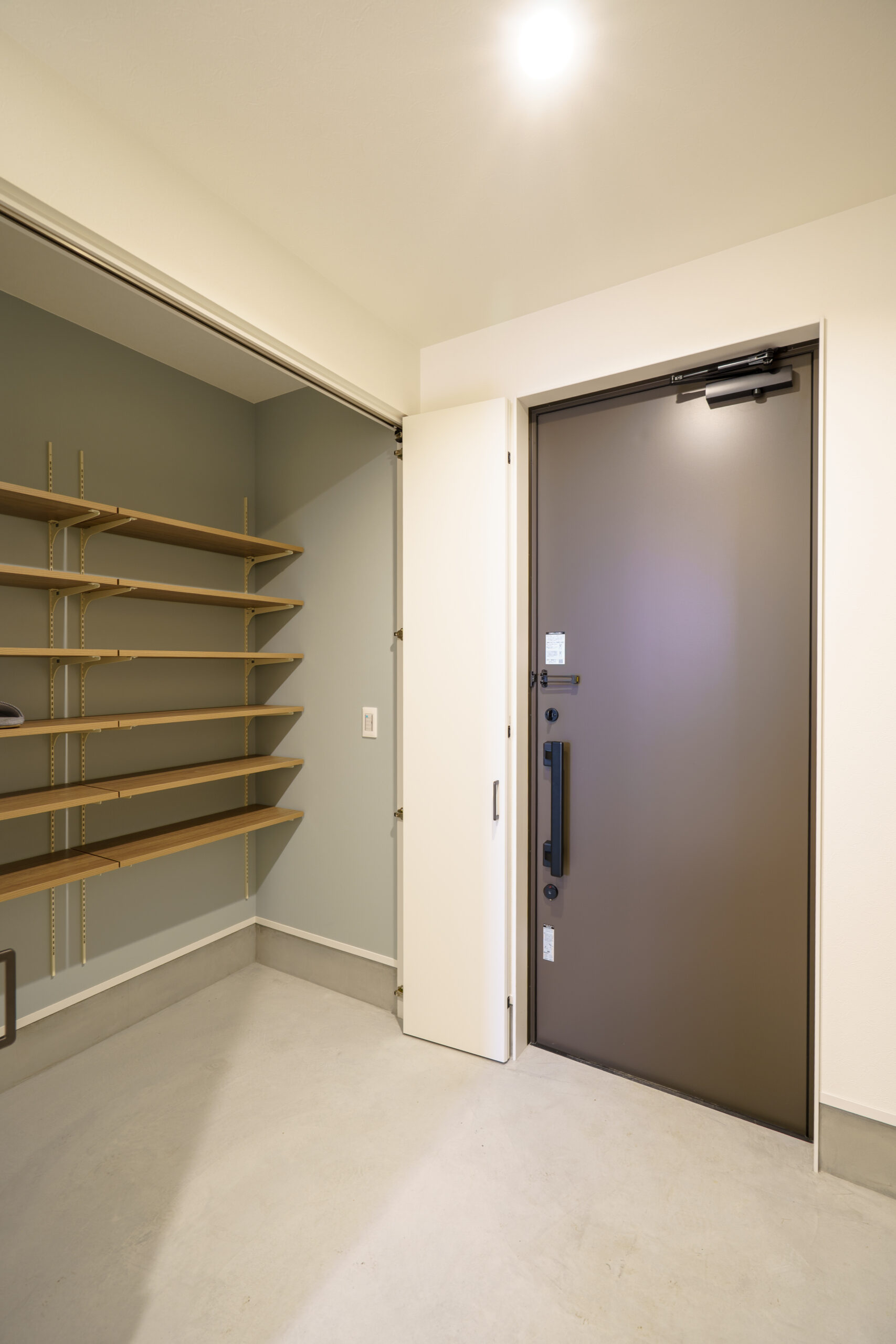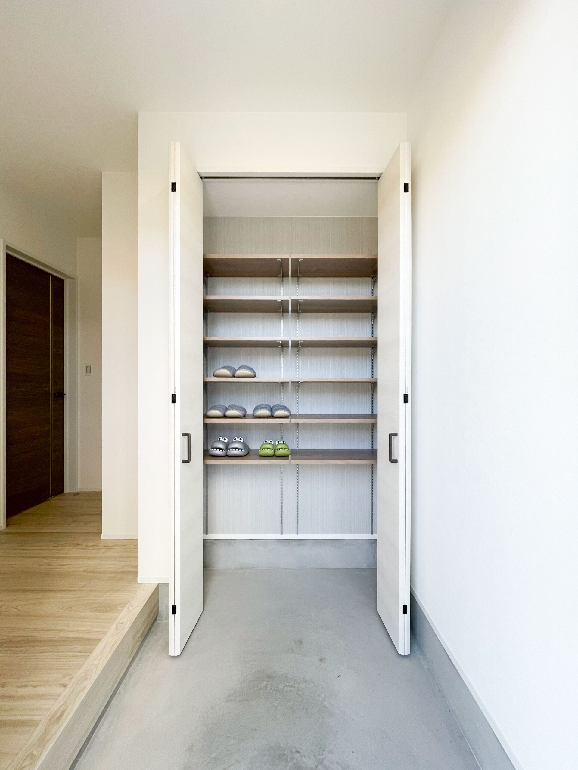 帰宅後すぐに靴や子どもの外遊び道具をしまえるシューズクロークで、玄関はいつもでもスッキリ。
