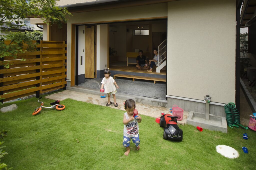 子どもが元気に走り回ったり、夏はプールで水遊びをしたり、休日は友人を招いてバーベキューやティータイムも。