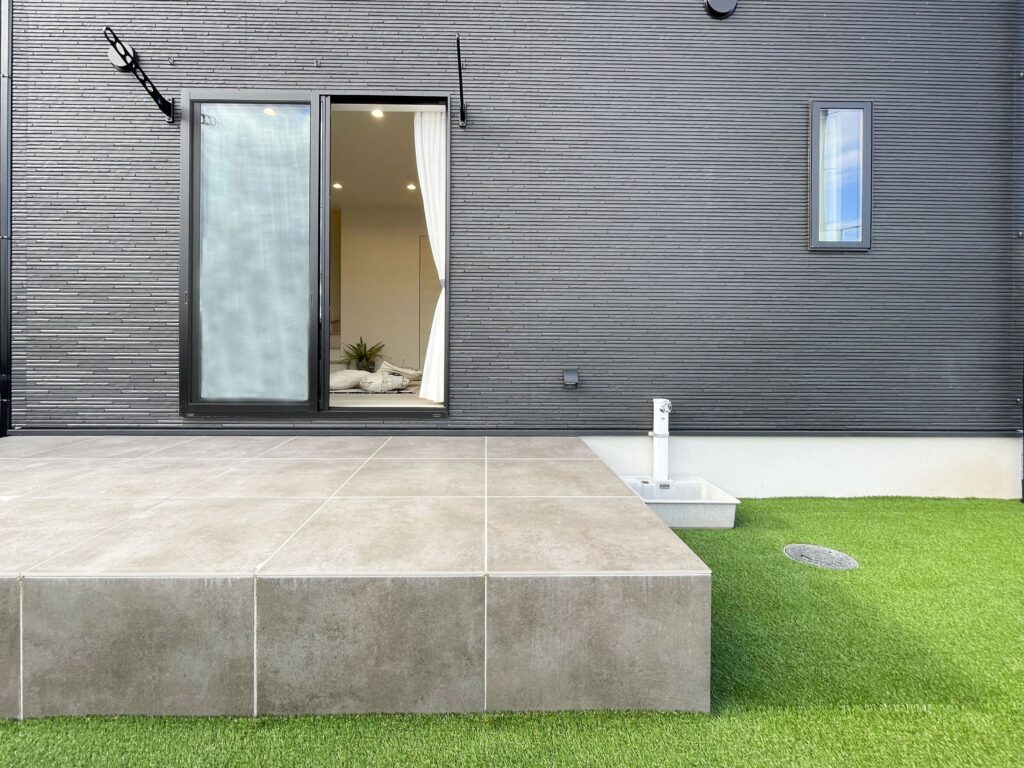 「家族でのびのび過ごせる時間を大切にしたい」というお施主様の想いを叶えるタイルデッキと芝生の庭。