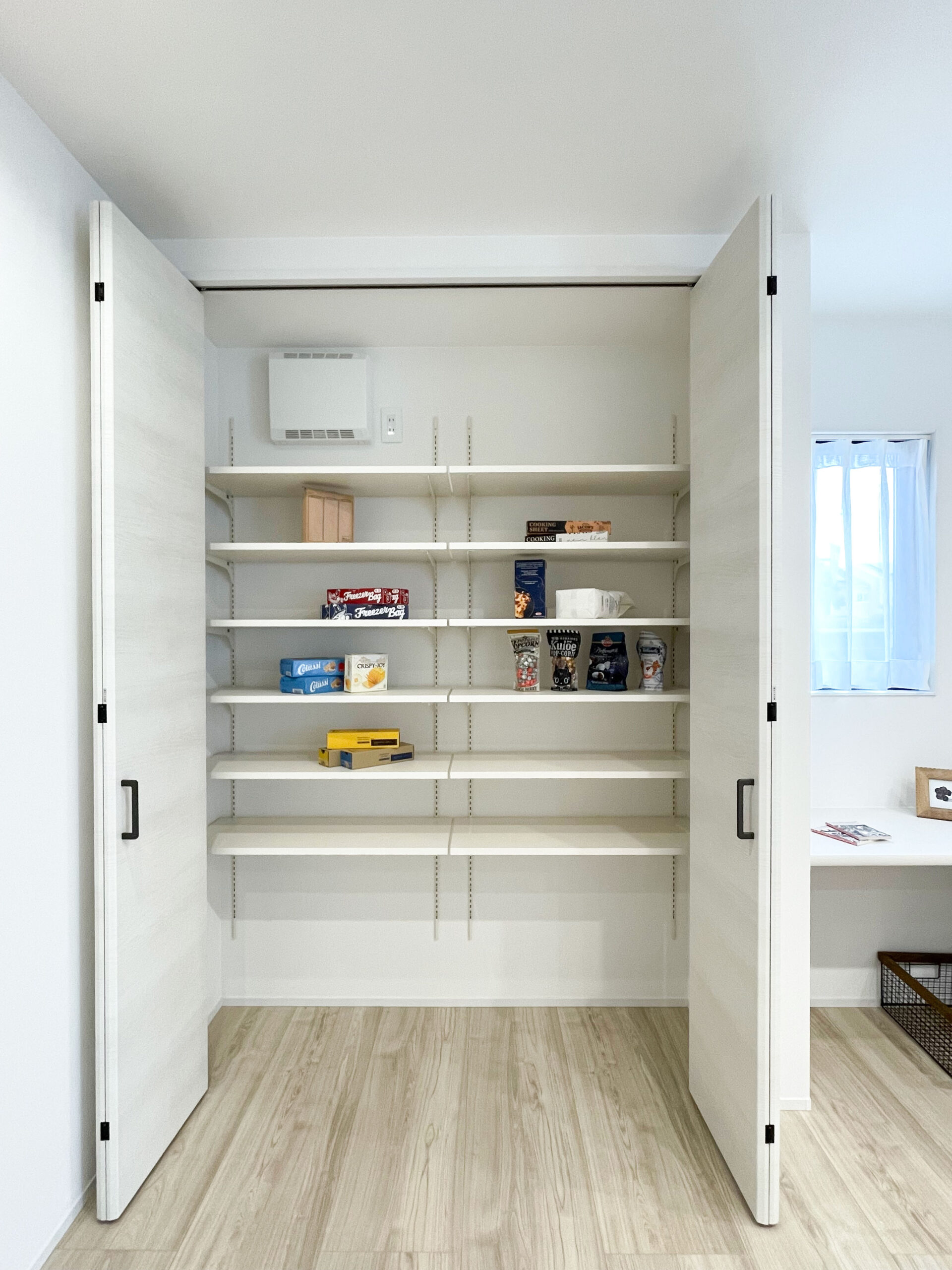 横長に設計されたパントリーは、どこに何があるか一目で分かるので、食材や日用品を効率よく管理できます。ストックの把握もしやすく、買いすぎや探す手間も減らせます。