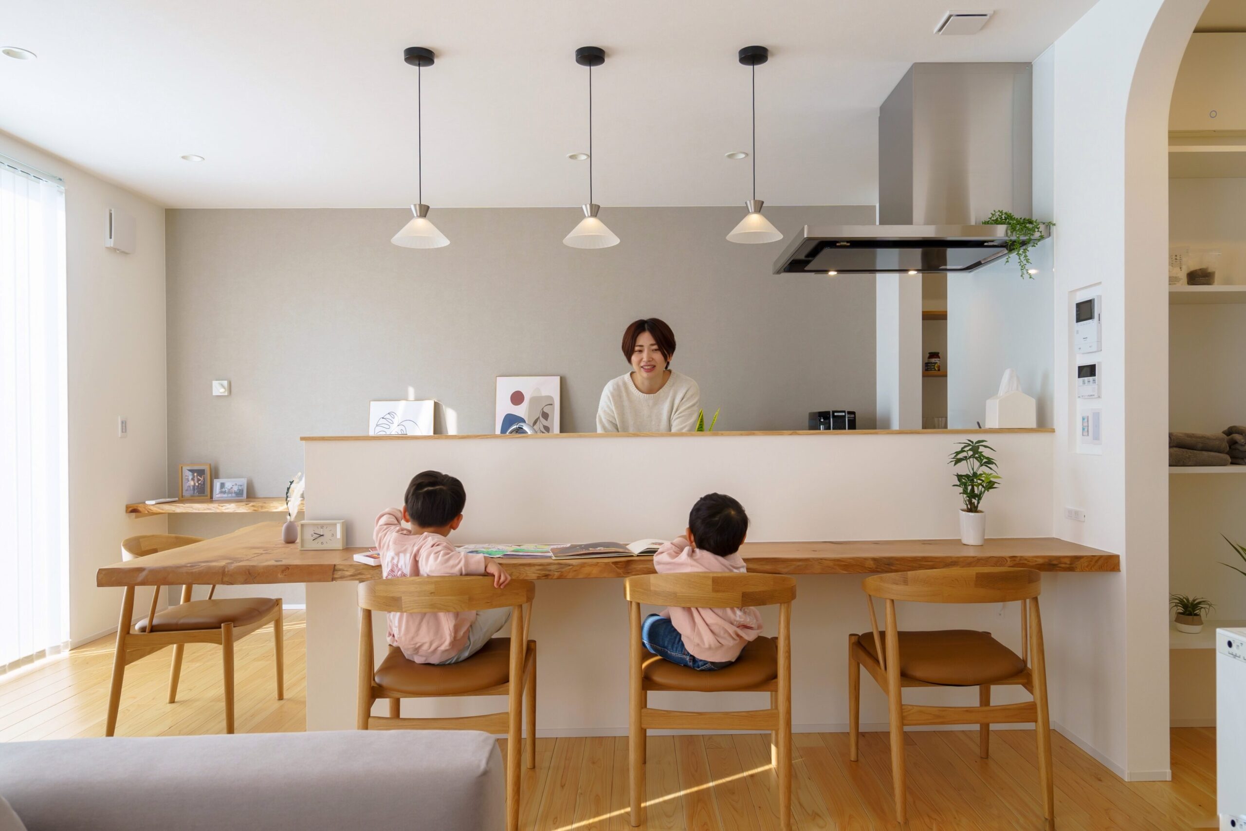無垢のカウンターが日々の食卓と家族の時間をやさしく育んでくれます。