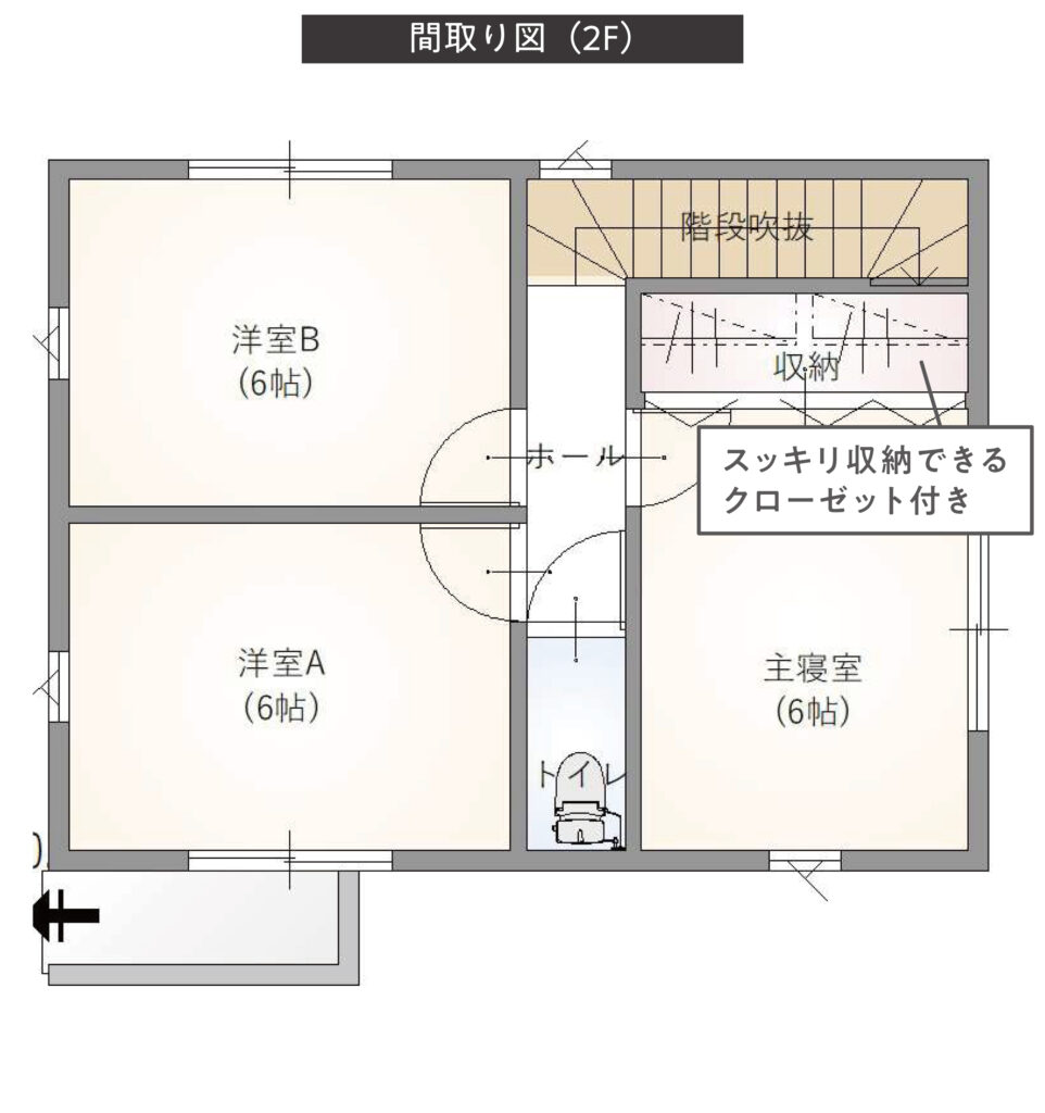 2階には6帖の洋室が2部屋と、6帖の主寝室が1部屋の使いやすい間取り。