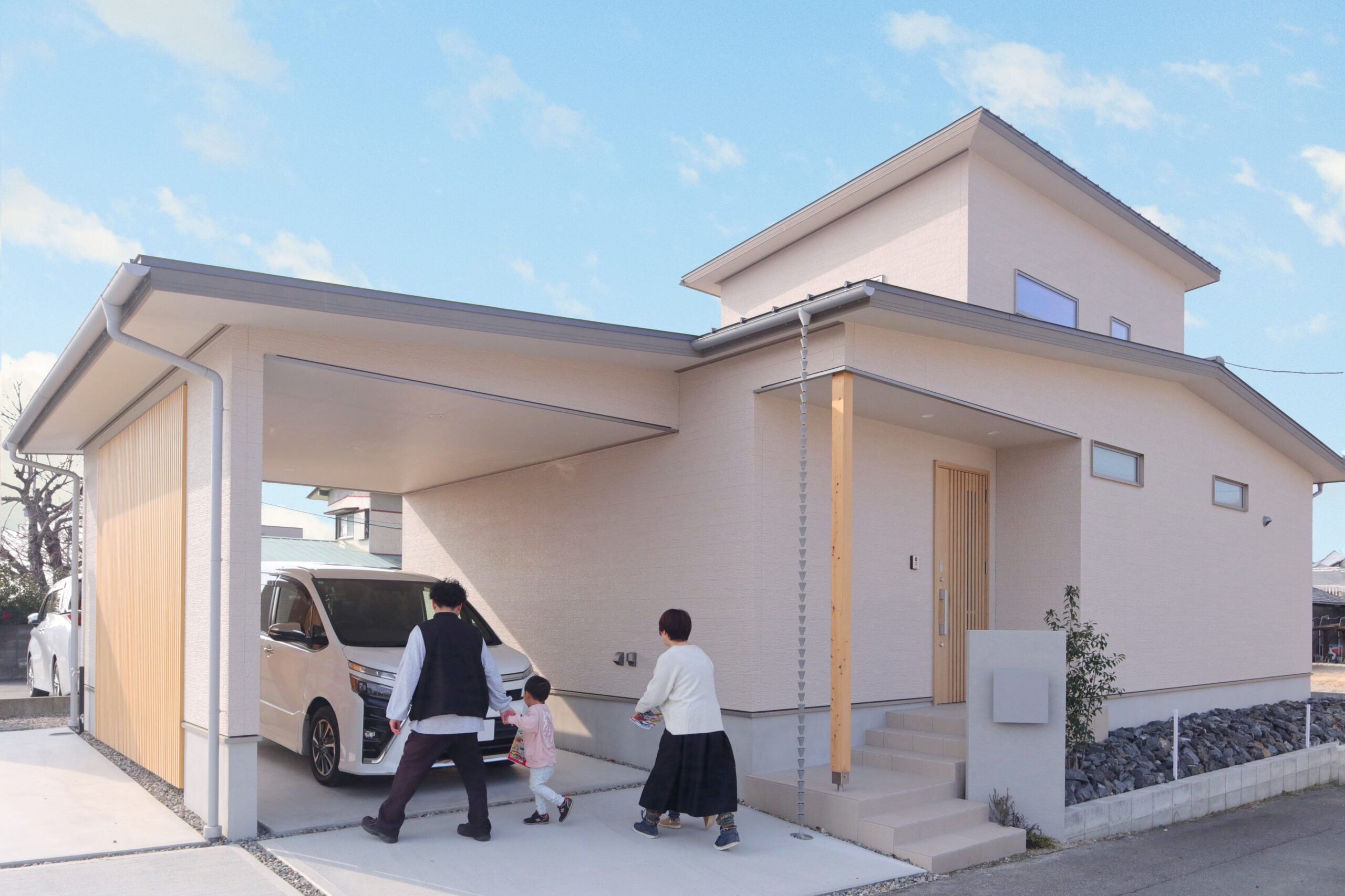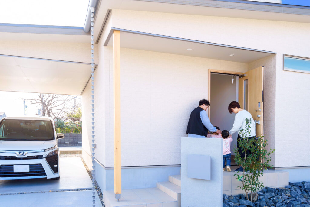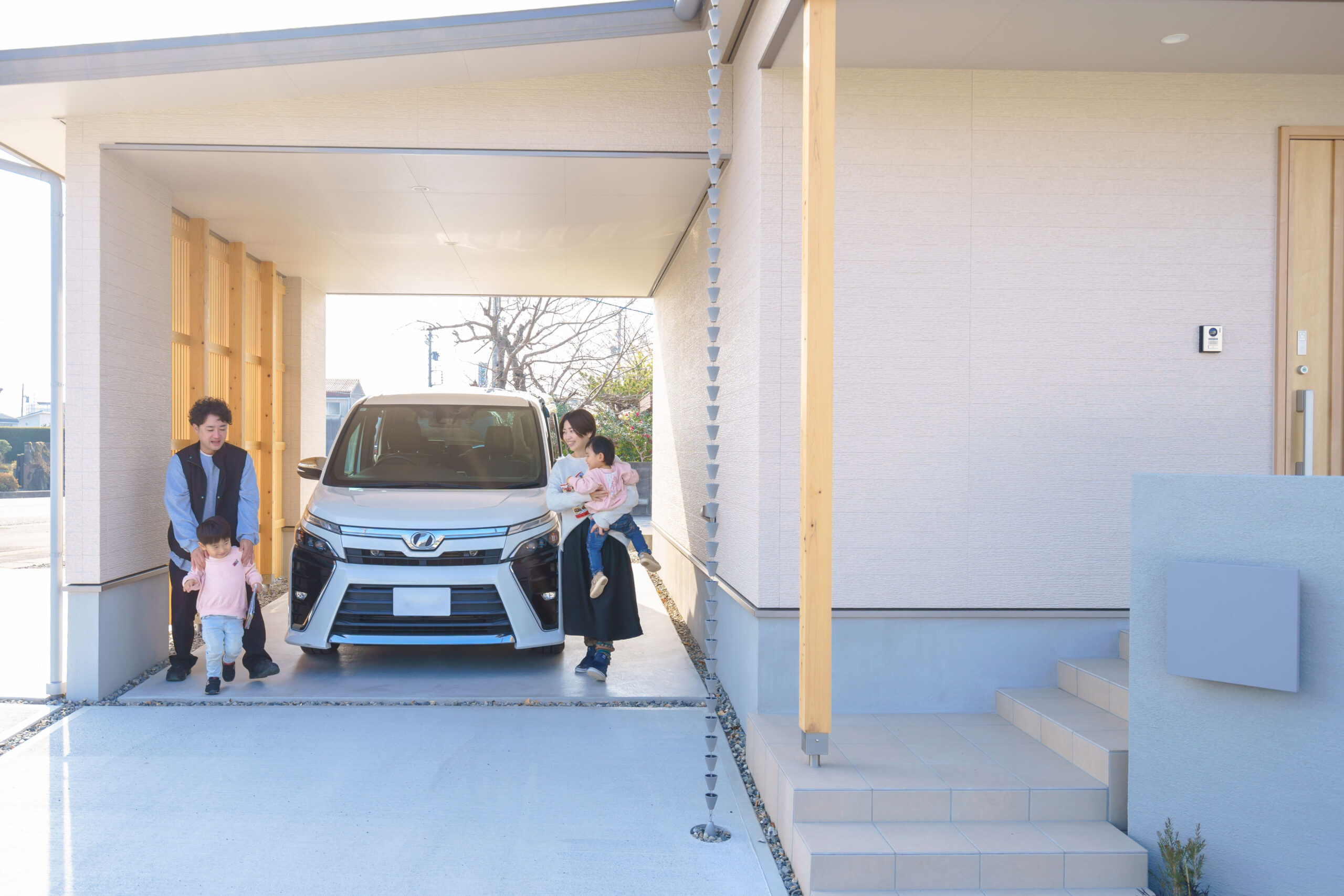 雨の日も、暑い日も、慌てずに車の乗り降りができる安心のガレージ。子どもを抱っこしたままでも動きが止まりません。