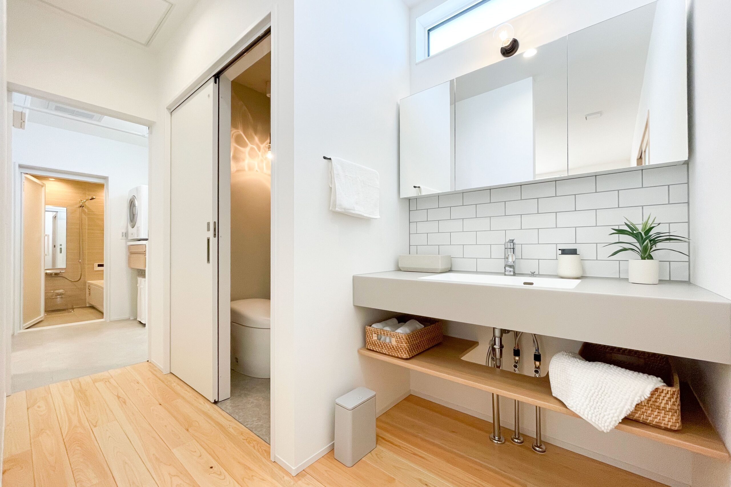 リビングから、脱衣室・トイレ・洗面室を通り、またリビングへ戻れる行き止まりのない回遊動線。