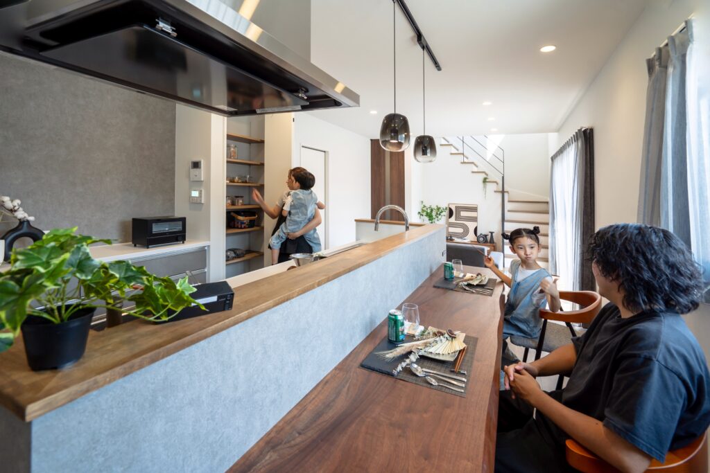 料理をしながらでも、リビングで遊ぶお子さんの様子が自然と目に入るキッチン。