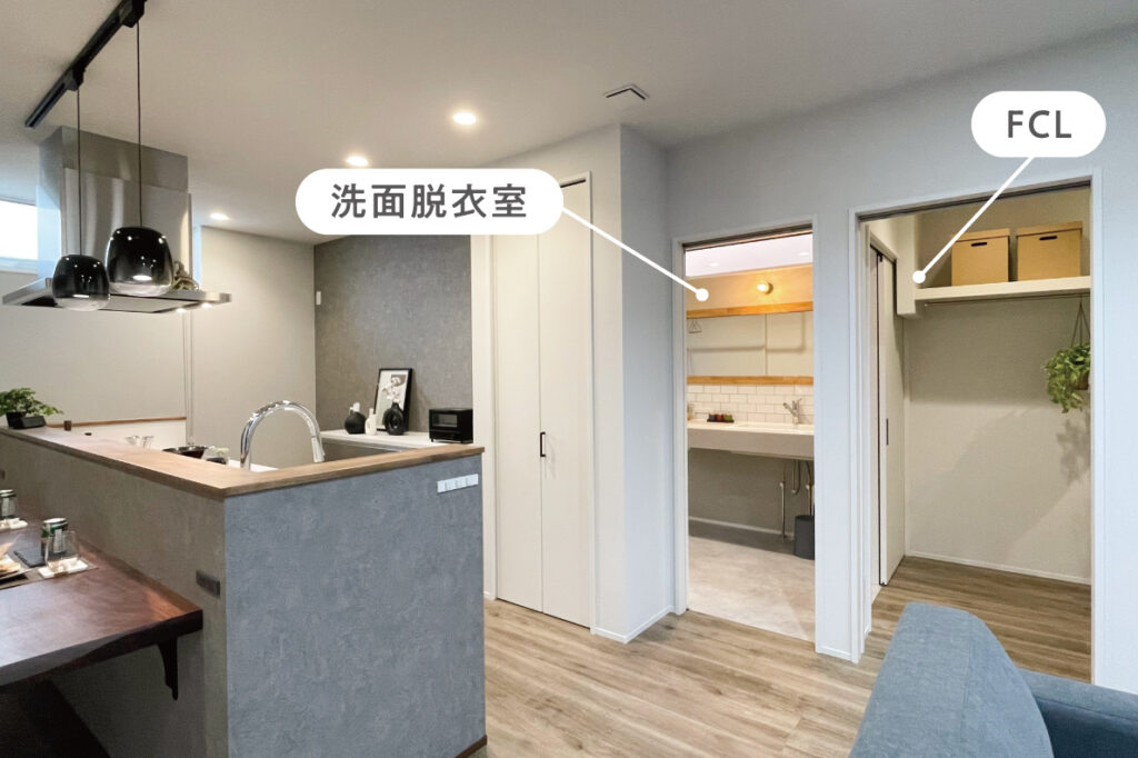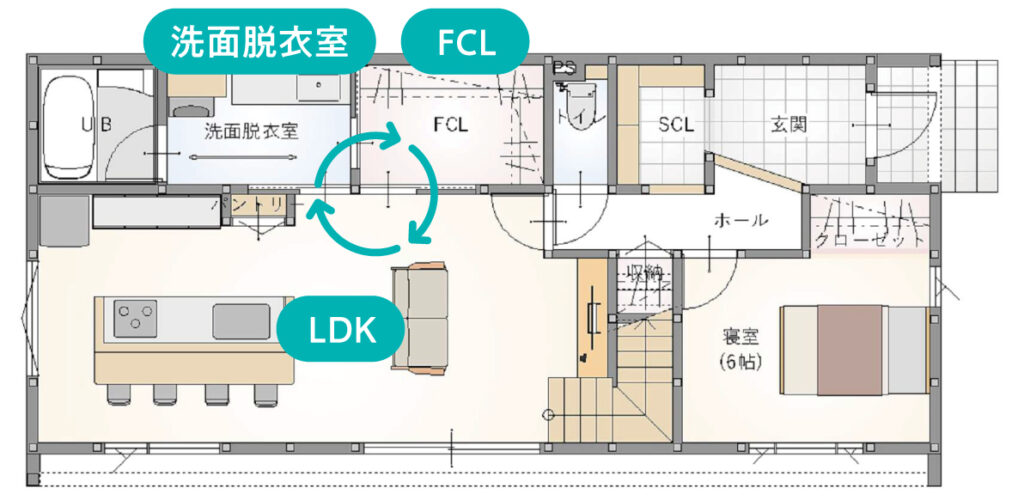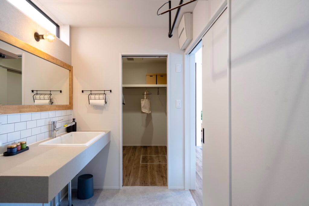 LDK→洗面脱衣室→ファミリークローゼット→LDKがぐるっと回れる回遊動線で、家事効率がアップ。
