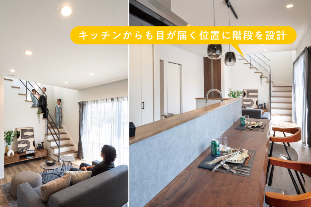 2階へ行く時も必ずリビングを通るように階段を配置し、「いってきます」「おかえり」が自然と生まれる暮らしに。