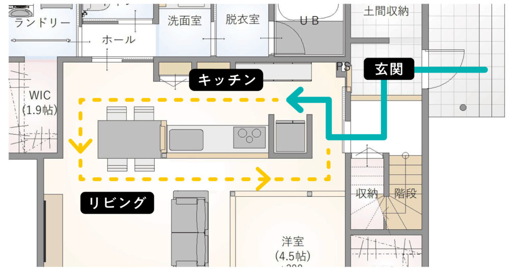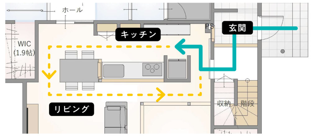 玄関からスムーズにつながる動線で、買い物帰りの動きも自然に整う。