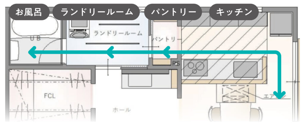 キッチンからパントリー、ランドリールーム、お風呂へとつながる間取り。