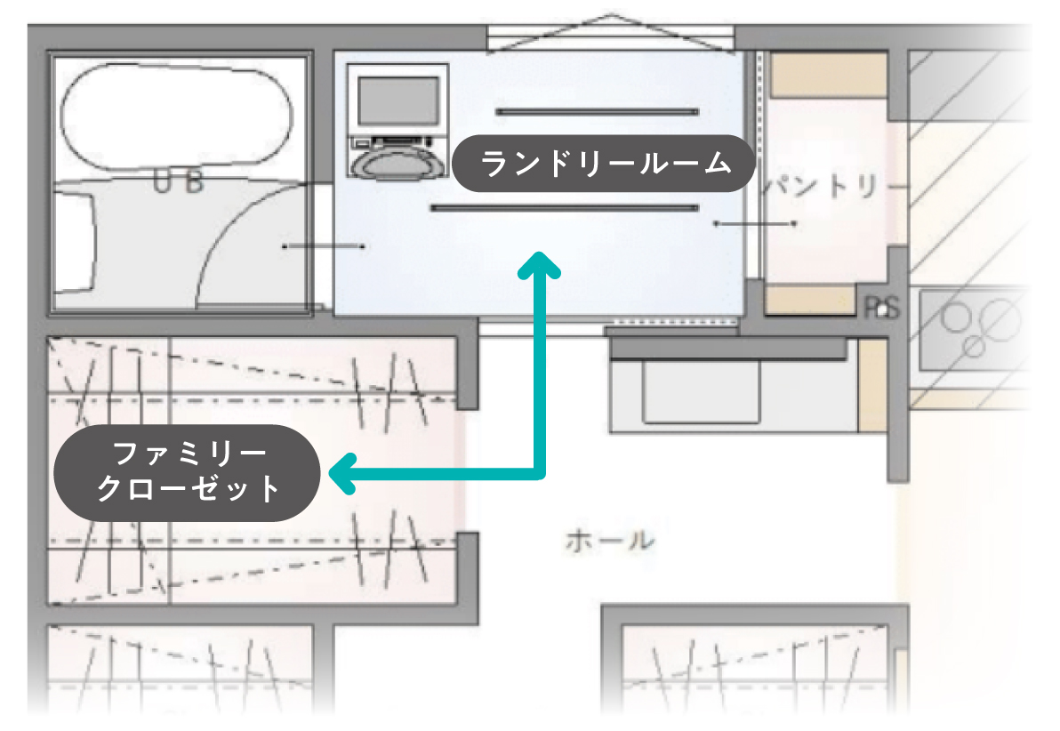 ランドリールームで洗濯をし、乾いたらすぐ隣のファミリークローゼットへ収納。