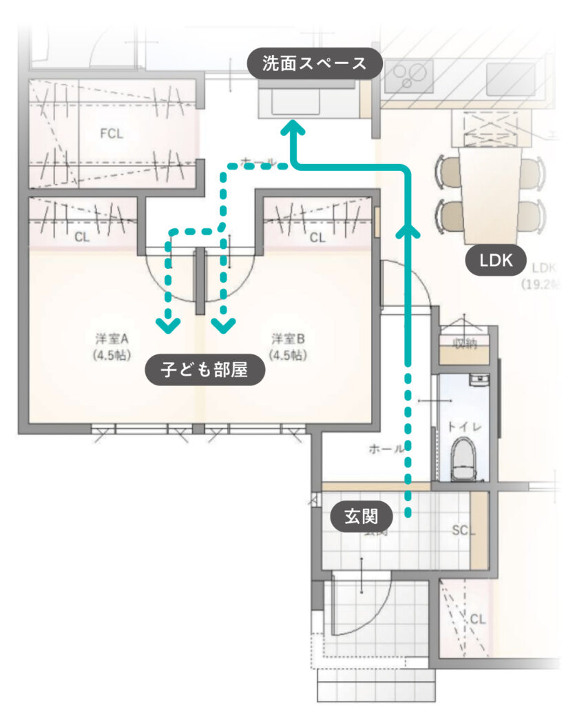 帰宅後は、LDKと洗面スペースを通って子ども部屋へとつながる間取り。