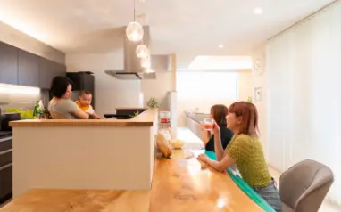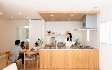 厳選した三重県産のヒノキの柱・土台、杉赤身材を適材適所にふんだんに使うことで、強固な構造を実現。ヒノキは伐採してから200年かけて強度を増していくと言われています。さらに無垢材は天然の調湿作用があり、家そのものが呼吸をします。本物の職人の知恵と技術から生まれる天然木の「本物の家」が、何世代にもわたって家族を優しく包みます。
