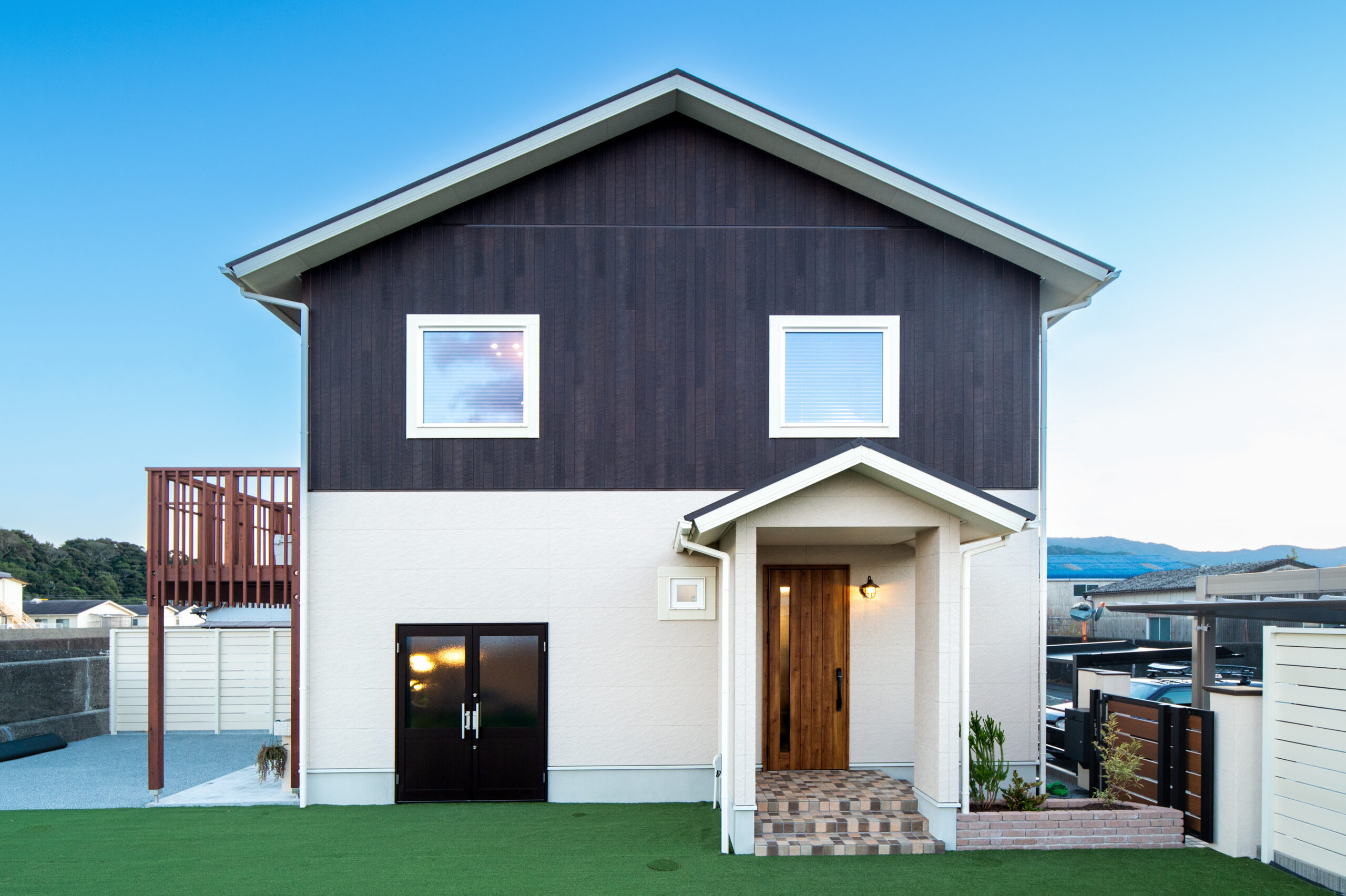 アプローチにあるインターフォンと玄関をわけたシンプルモダンな二世帯住宅。建物内では1階中央の部屋を介し、親世帯と子世帯を繋ぎます。
