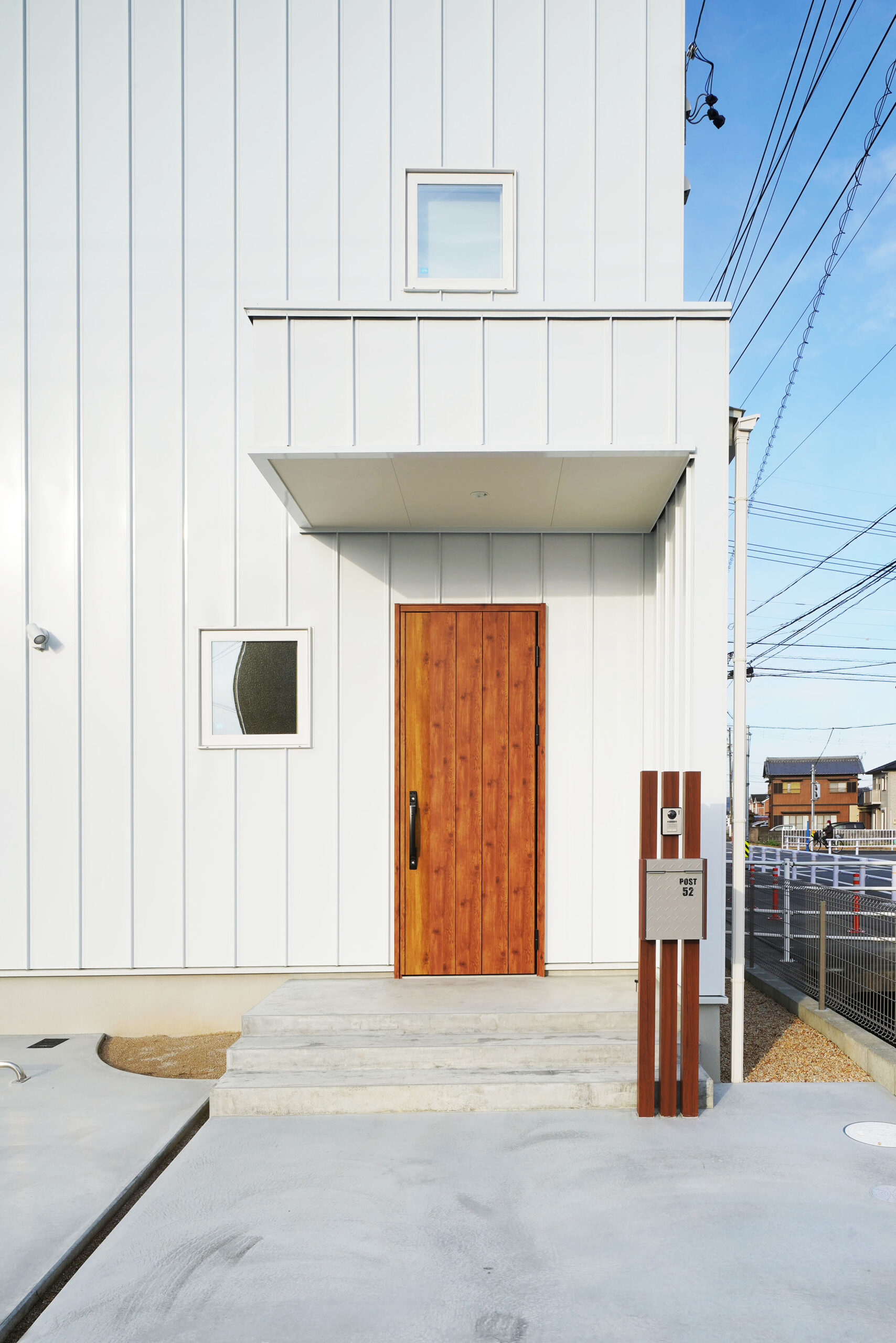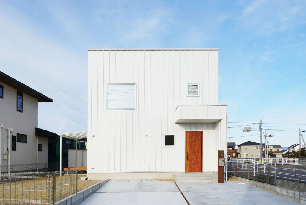 真っ白なガルバリウム鋼板に、木目の玄関ドアがアクセントとして映える印象的な外観。