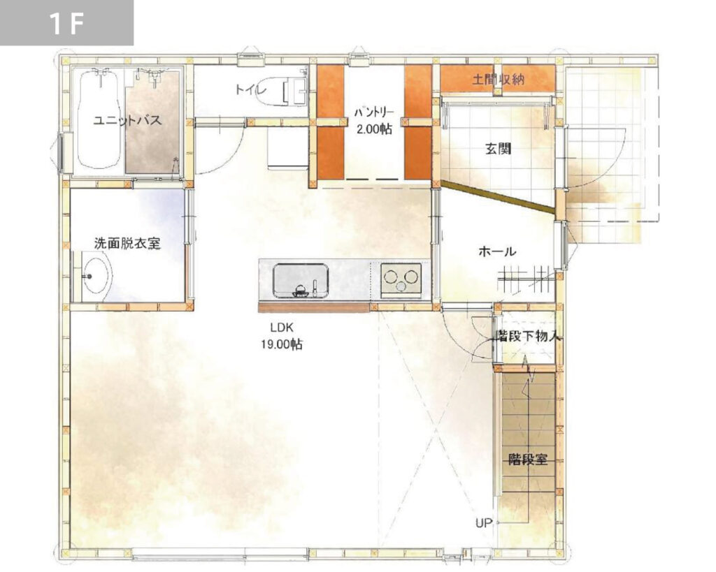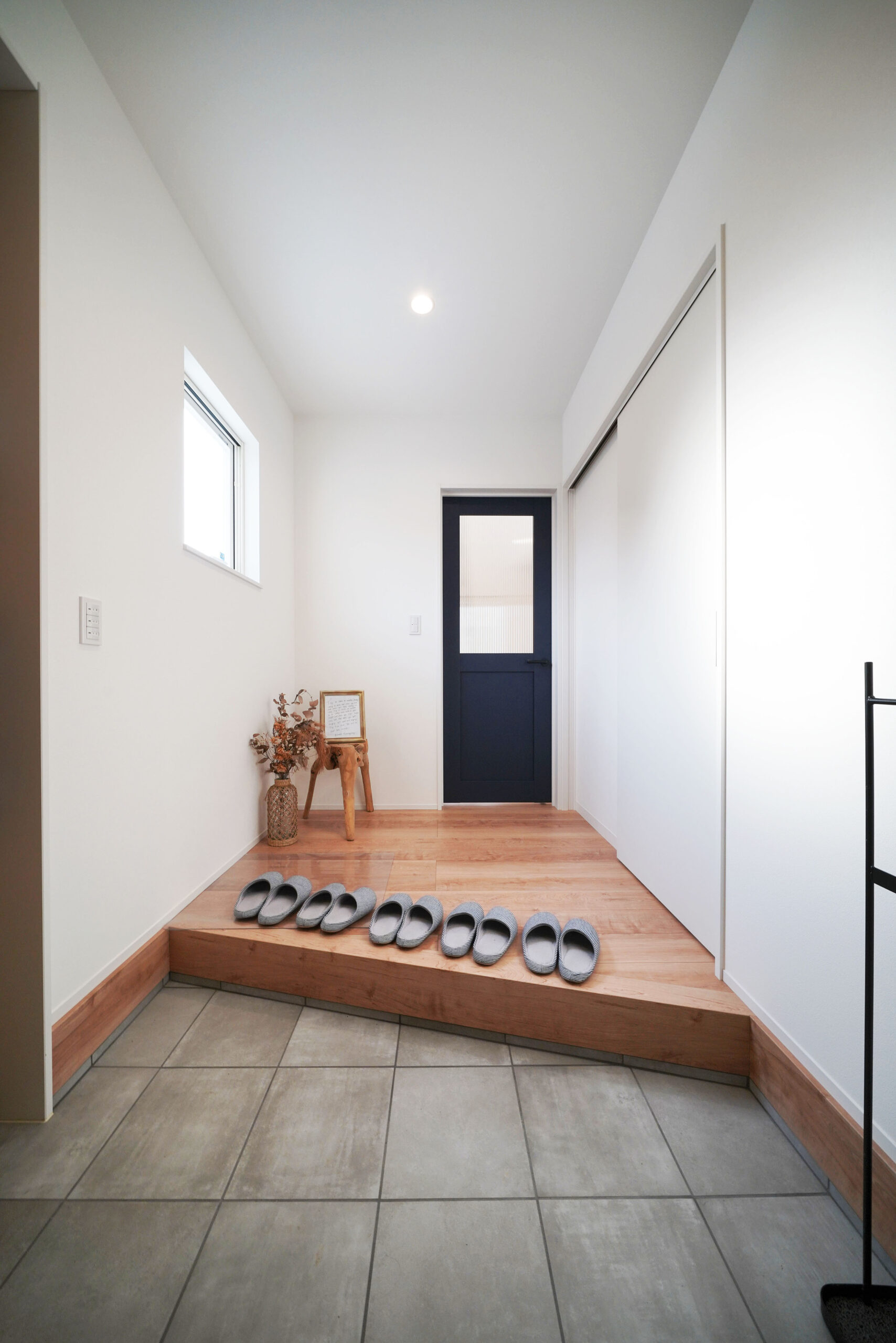 斜めに設けた上がり框(かまち)で空間に広がりを持たせた玄関。
