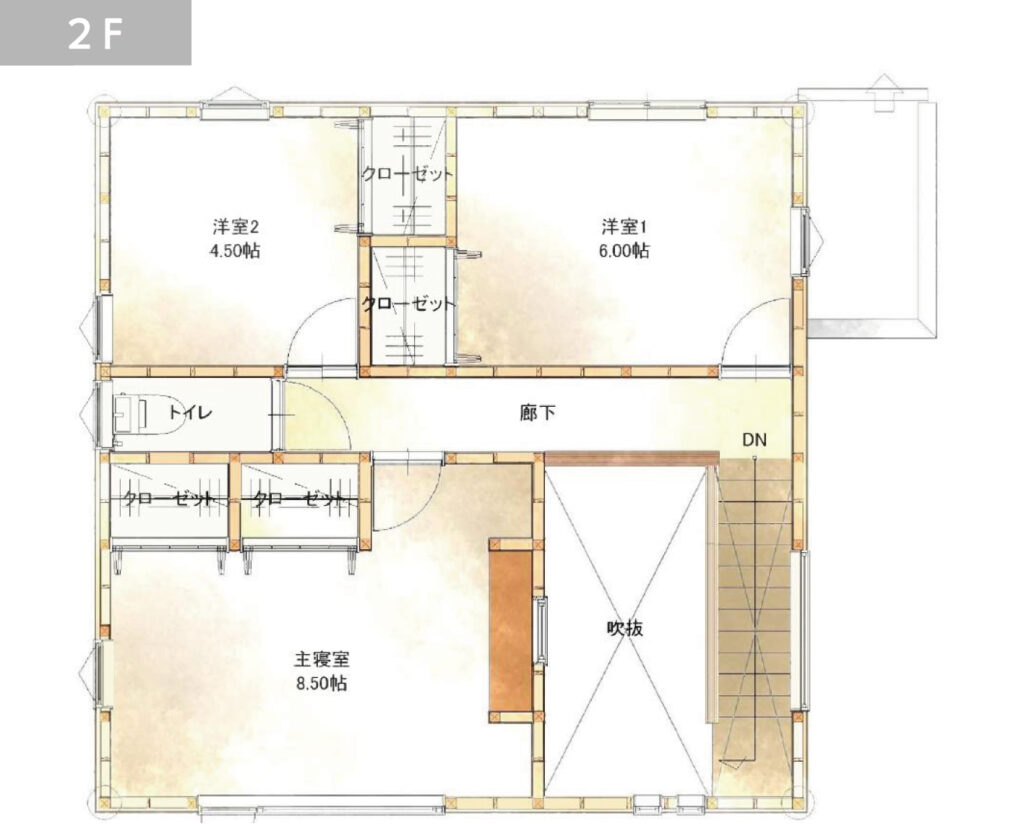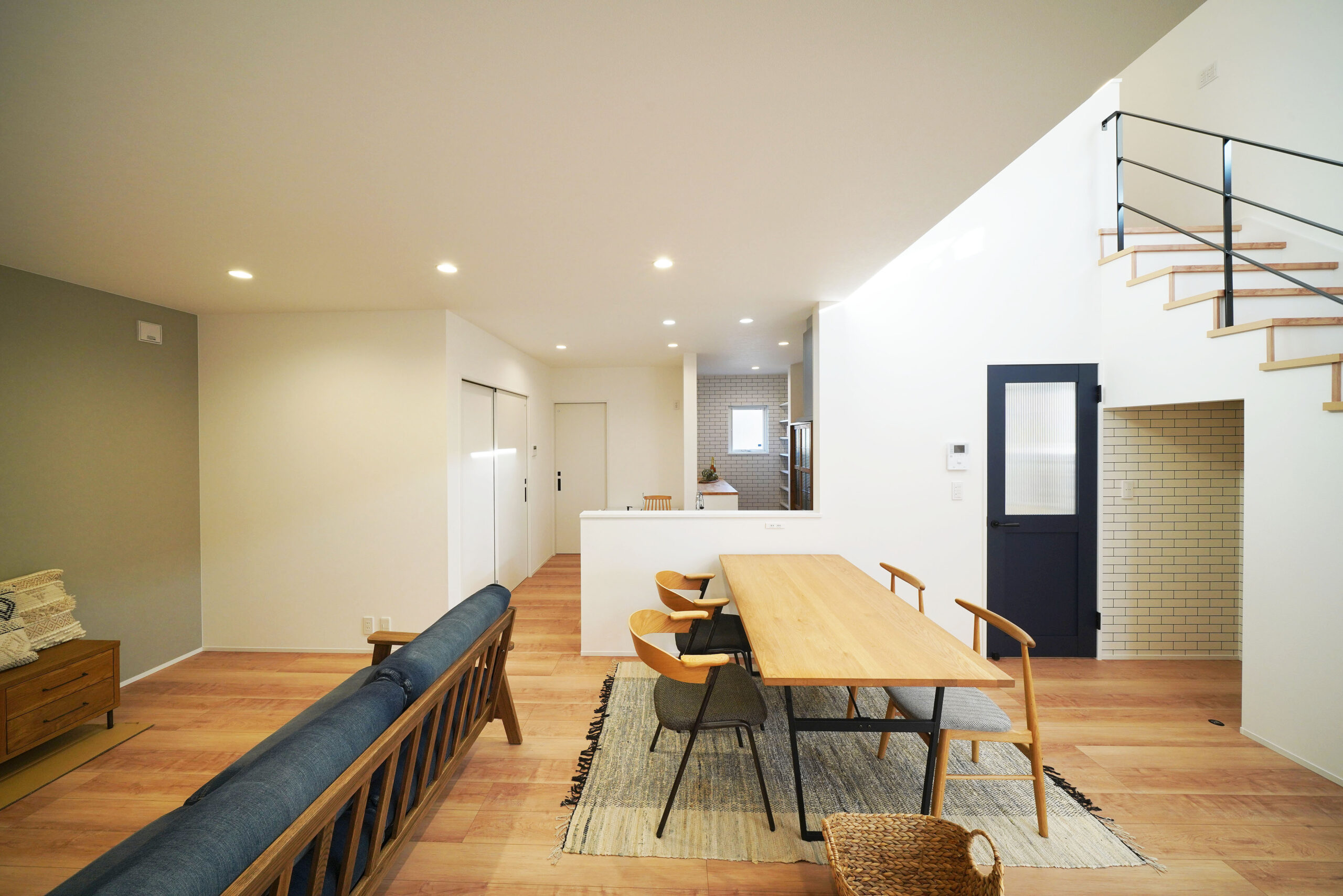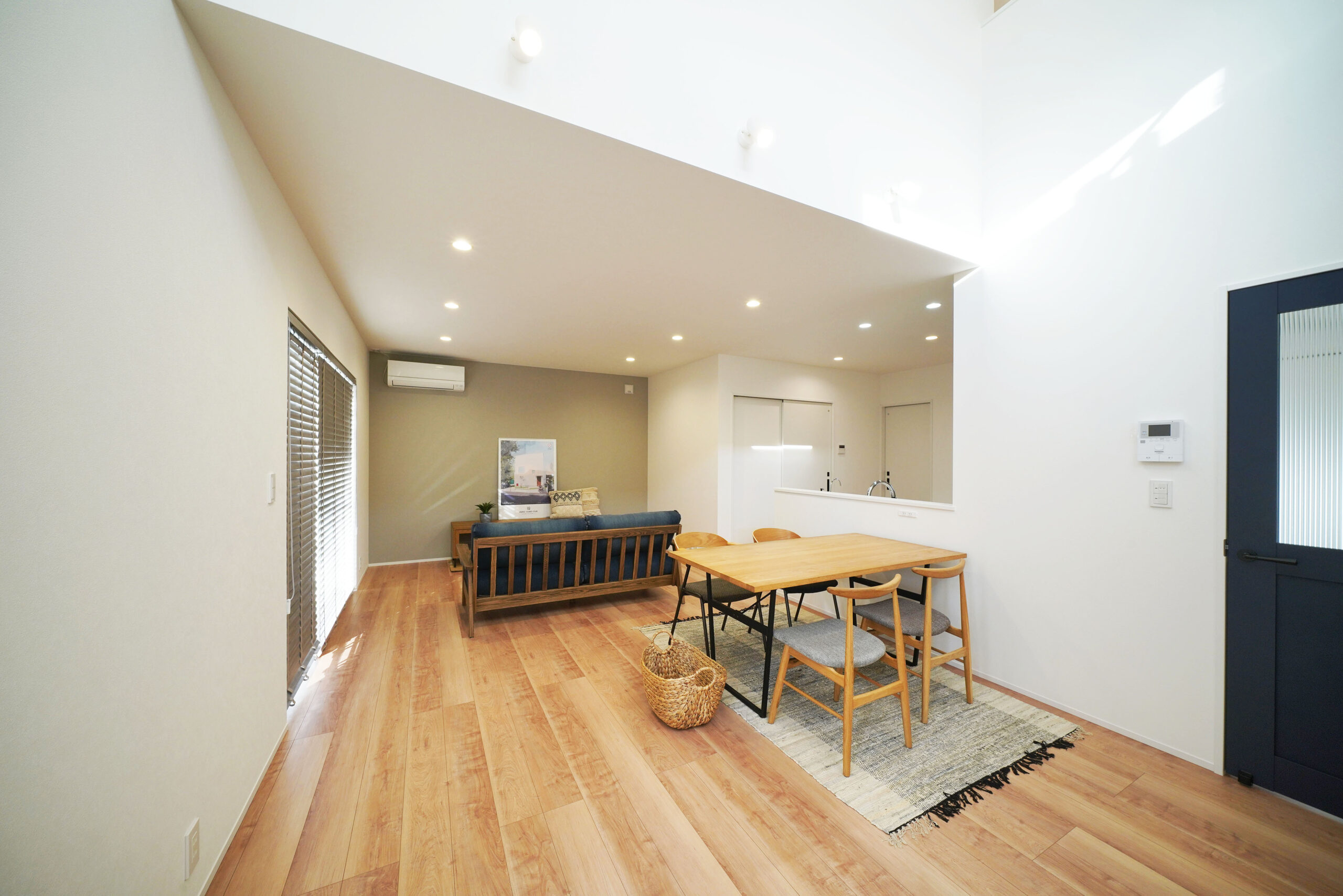 リビング上部には吹き抜けを設け、1階全体に光が行き渡るよう設計。