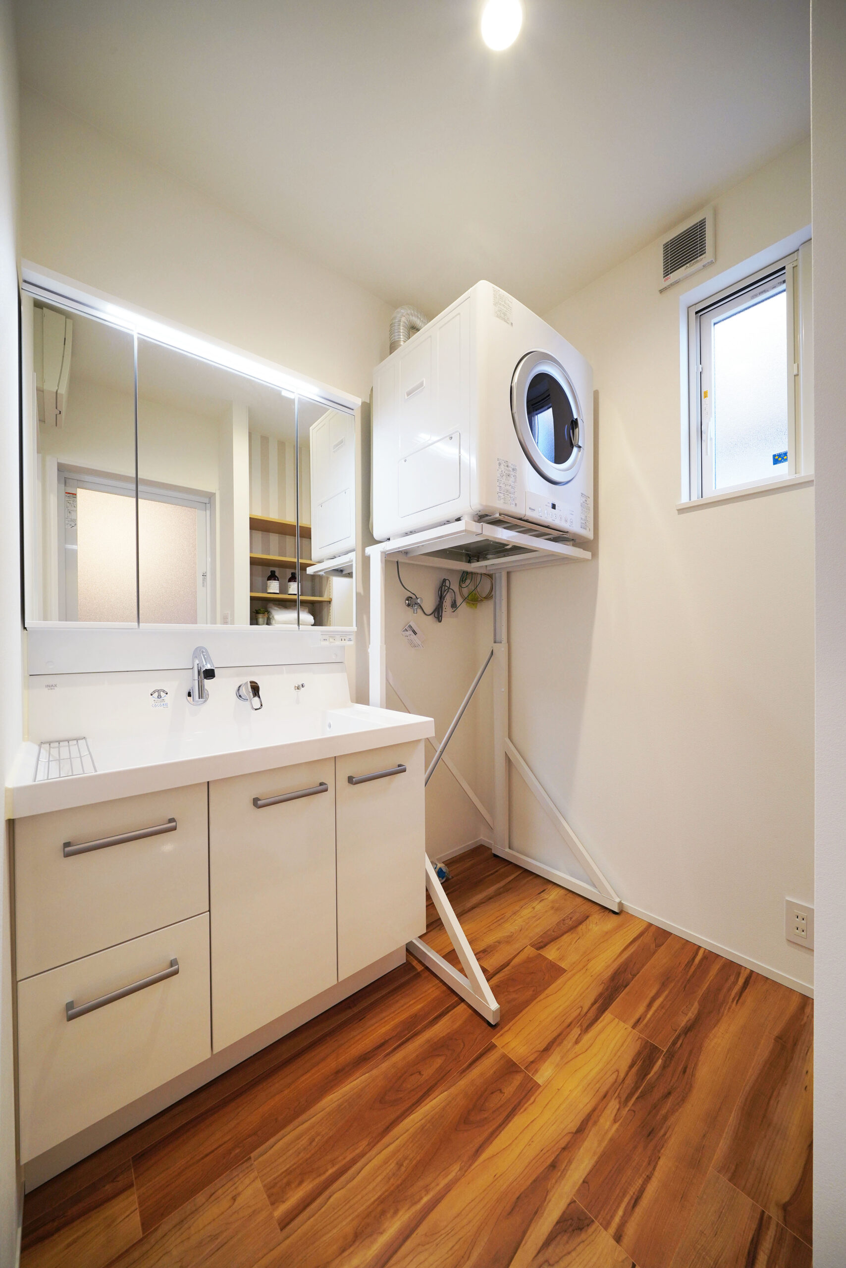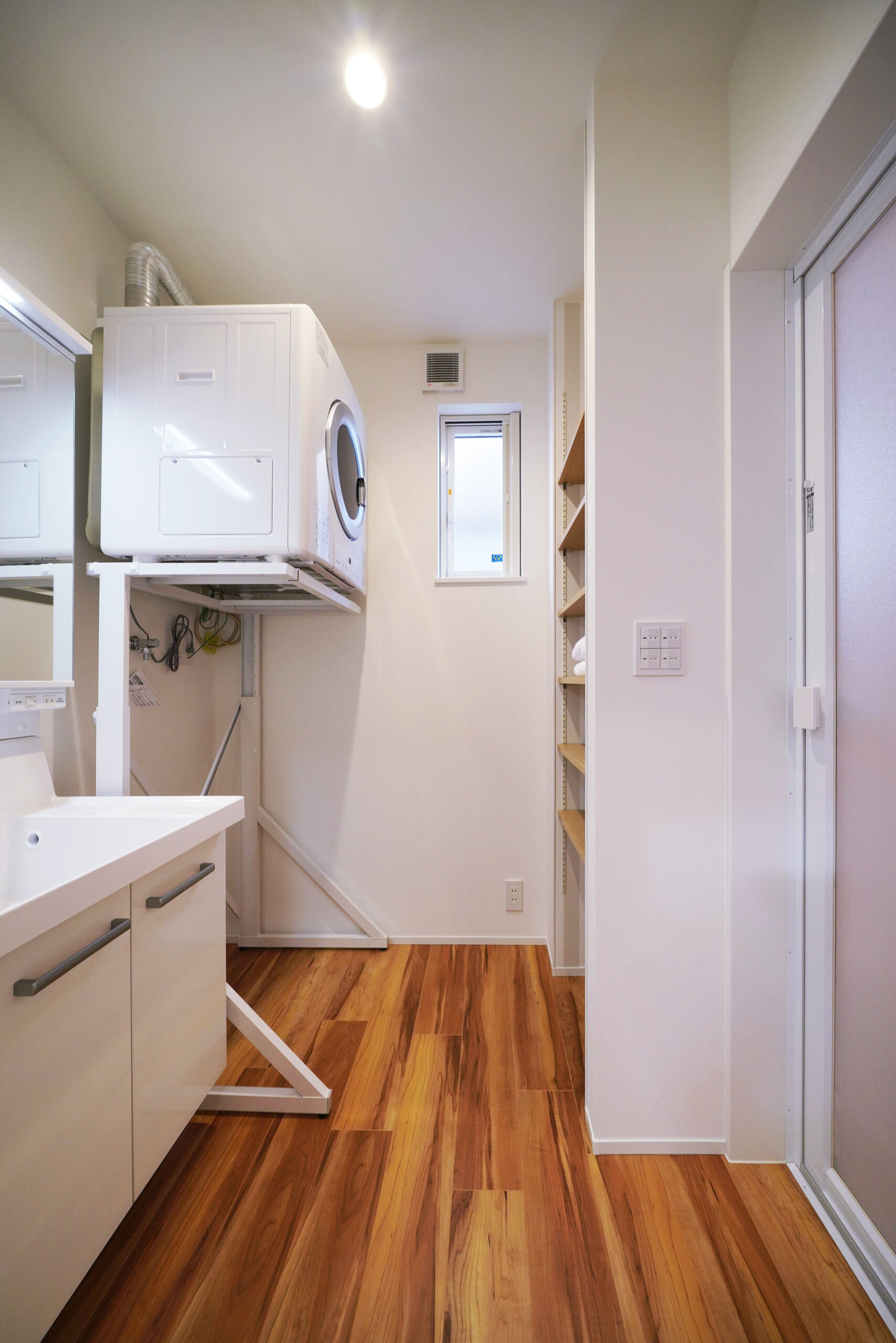 洗濯後はガス衣類乾燥機「乾太くん」でそのまま乾燥し、背面の可動棚に収納。