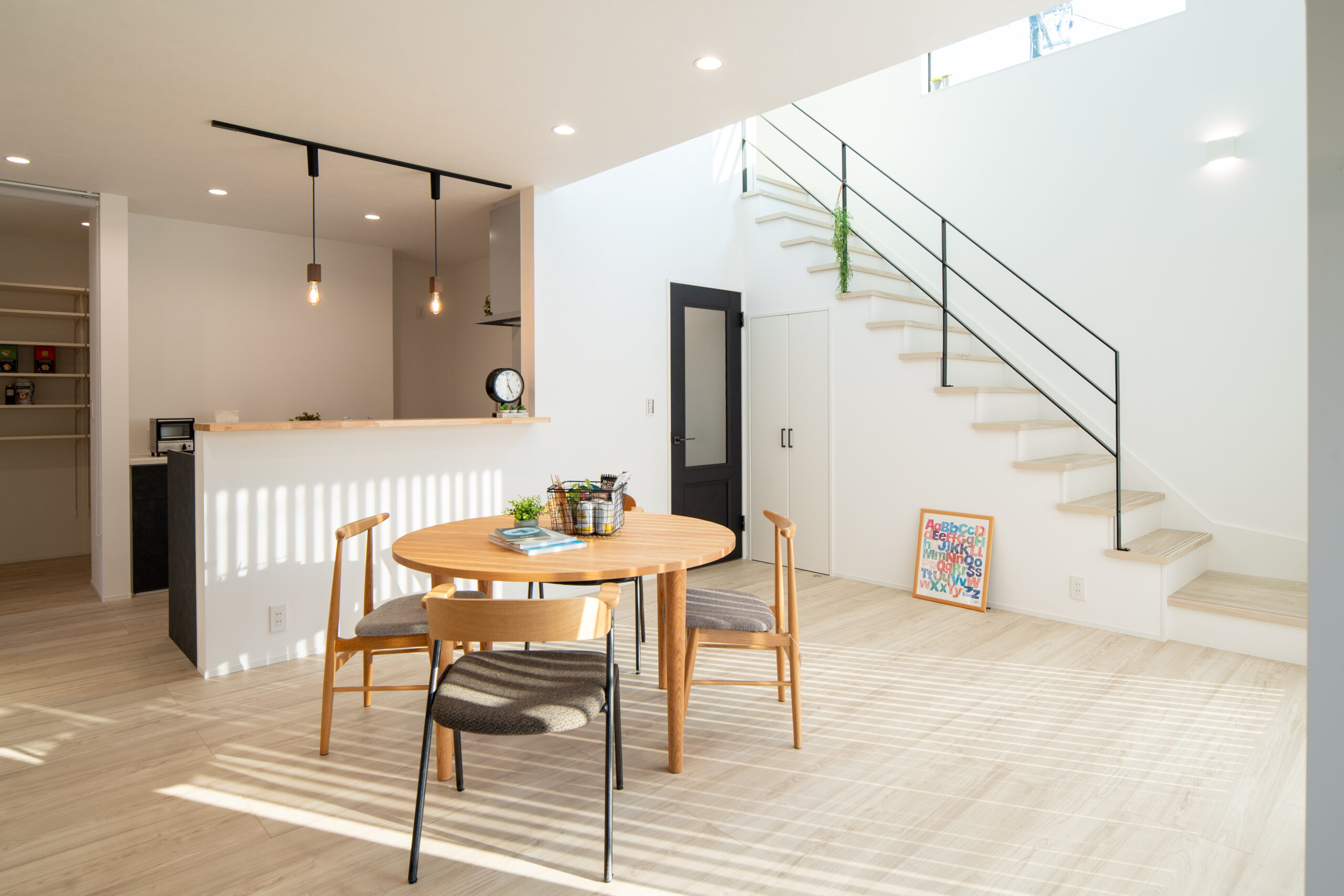 吹き抜けから届く光は、ダイニングはもちろん、リビングの奥までやわらかく広がる設計に。