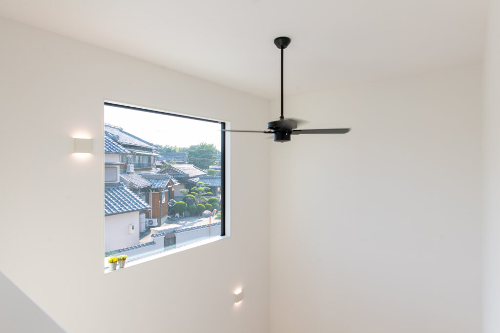 印象的なアイアンの手すりがある吹き抜けには、大きな窓を設置。