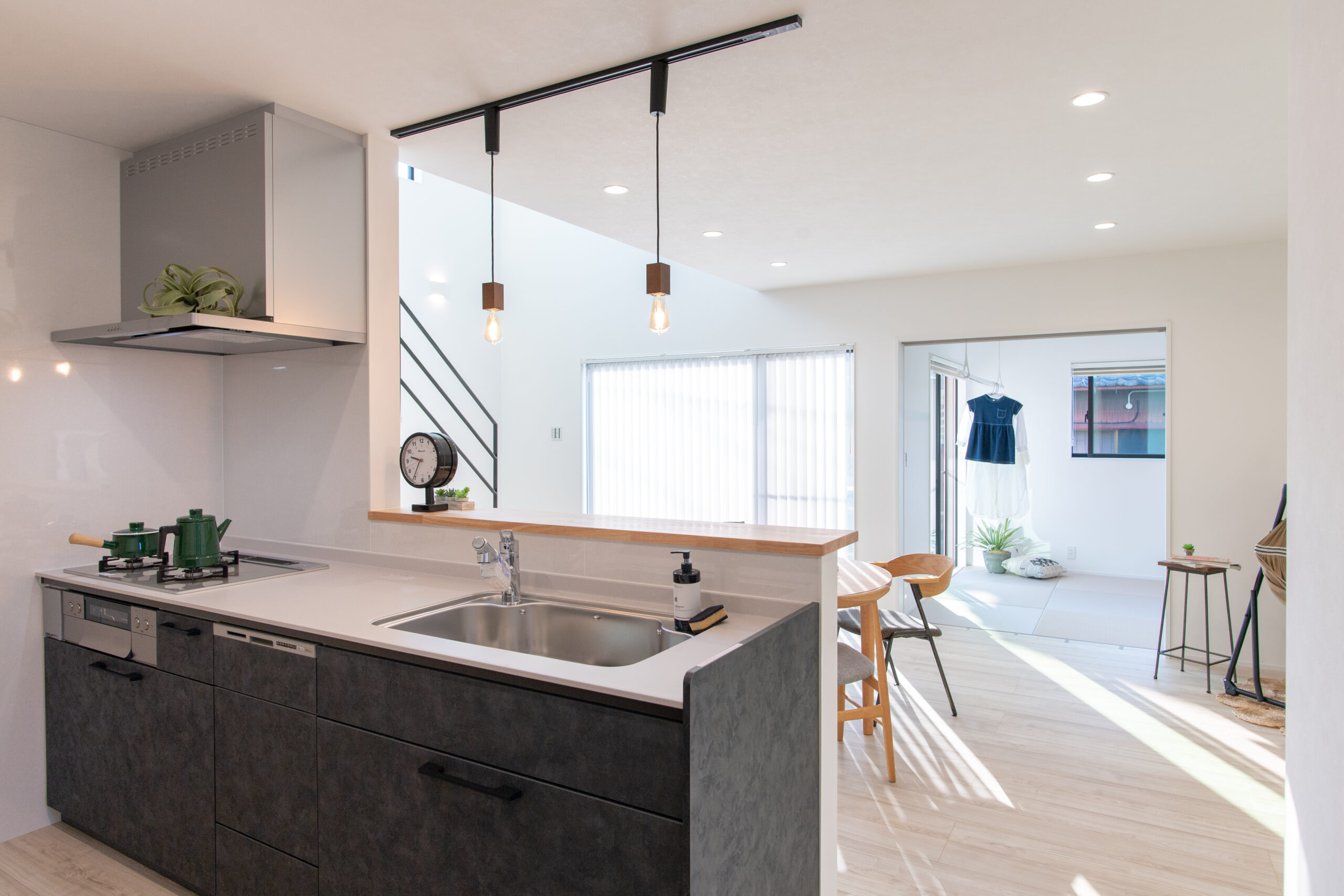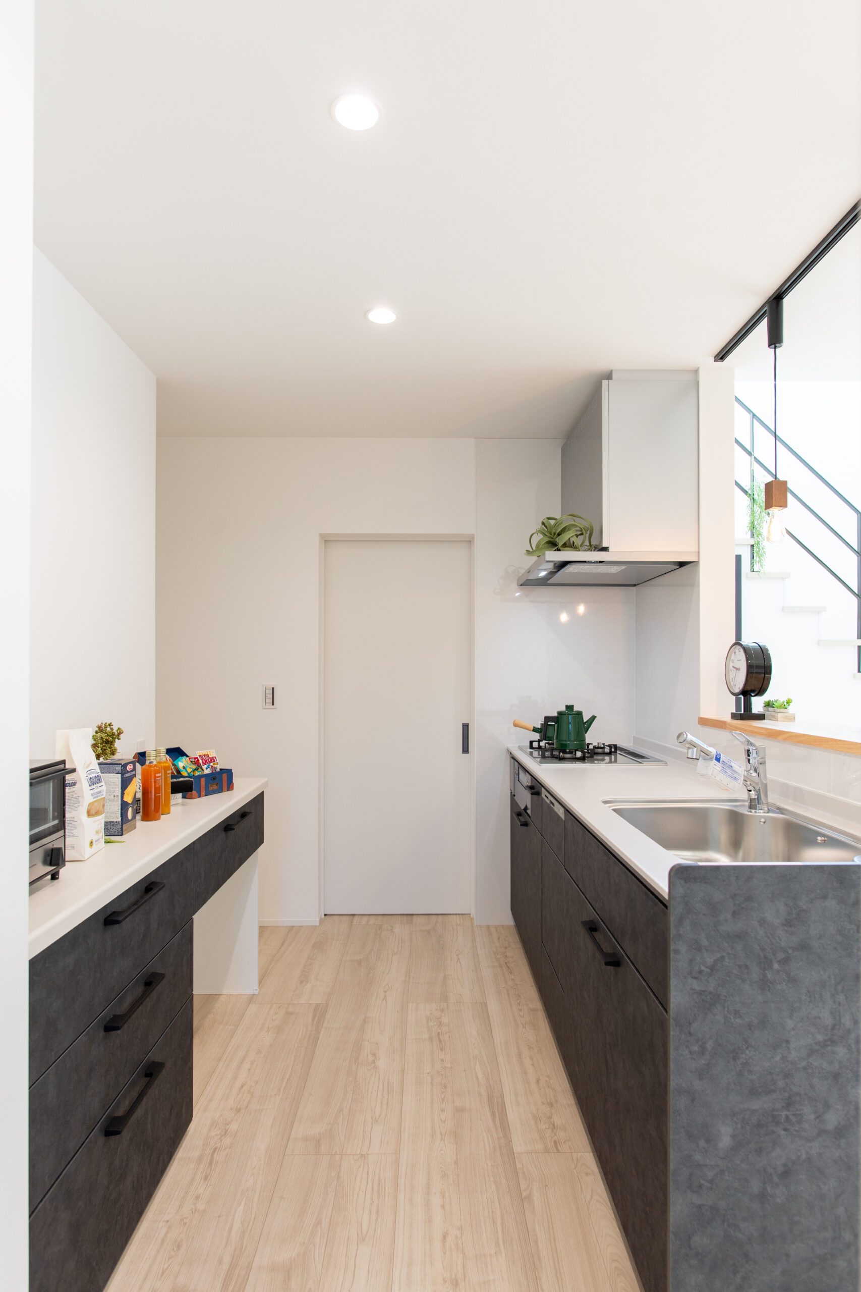 キッチンには、LIXILのシステムキッチン「ブラックスタッコ」カラーを取り入れ、空間全体が落ち着いた大人の雰囲気に。