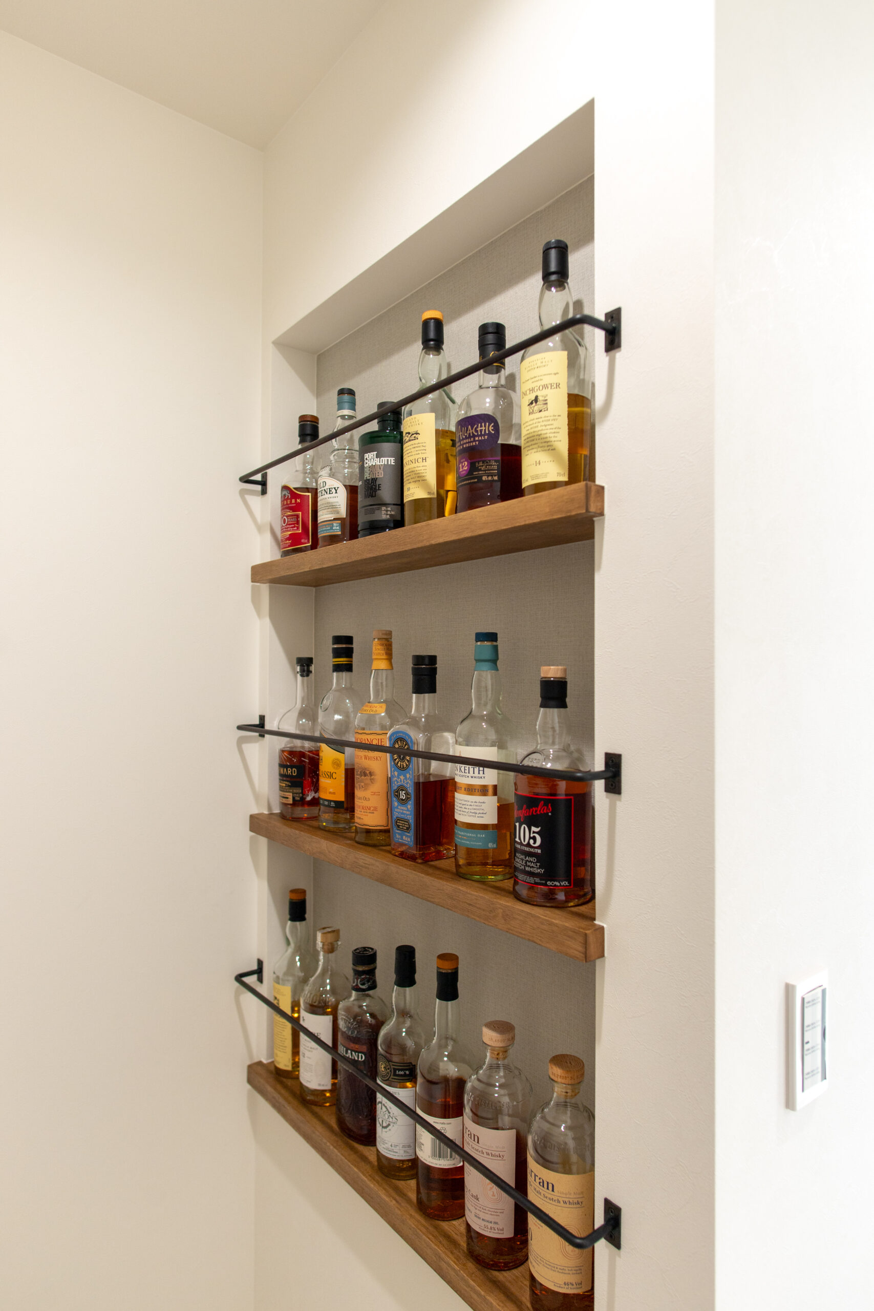 さらにウイスキー専用の造作棚を設け、お施主様のコレクションを美しくディスプレイ。