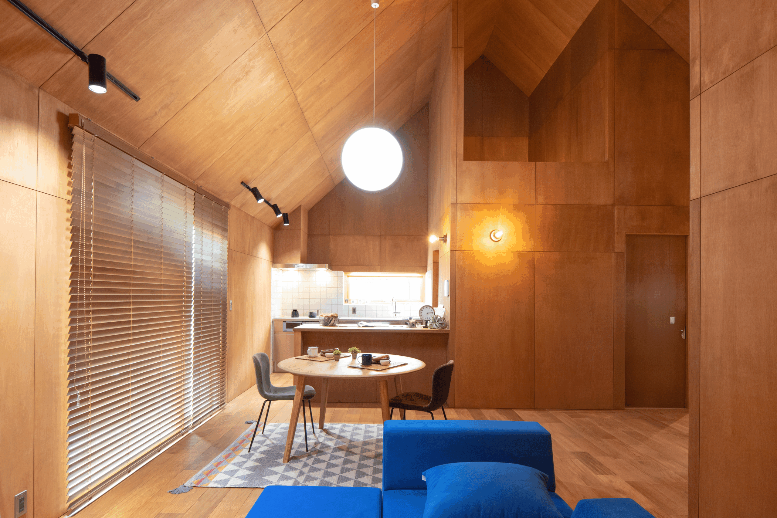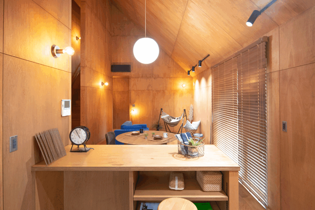 壁や天井はラワン合板で仕上げており、家具や雑貨の映える自然な風合いが魅力です。