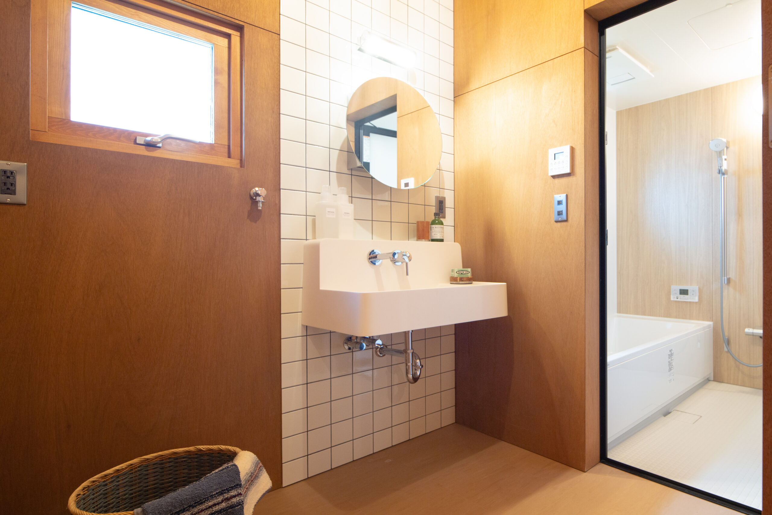 白タイルをアクセントに取り入れた洗面室には、収納付きの丸い鏡と、照明の電球を。